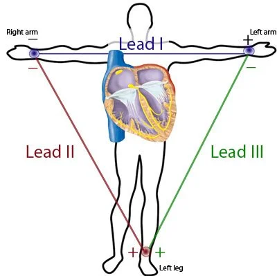 A standard EKG is made up of several “leads” or views of the heart. Each lead is a comparison of two points on the body and the cardiac activity that goes on between them. A basic 3 lead EKG (as in, there are 3 lead present for assessment) is based off the comparison of 3 different positive (or interpreting leads) and 1 grounding lead. This principle is the called the Einthoven’s Triangle. See below for a graphical representation of this concept.