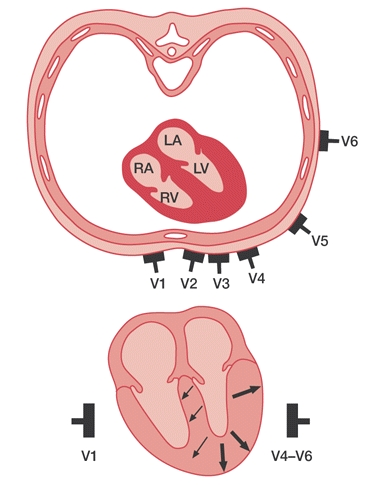 A 12 lead adds on the precordial leads - aka the chest leads. These leads are labeled V1-V6 and allow for a more in-depth localization of the heart. This is used to identify myocardial ischemia throughout the heart depending on the coronary artery vessels involved. With each coronary vessel feeding a different section of the heart, clinicians are able to identify which vessel is involved.